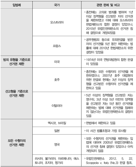 예전에는 구금형을 선고받으면 무조건 선거권 일체가 박탈되도록 법이 규정되어 있었다. 이에 ‘집행유예자들은 사회생활을 계속하고 있는데 왜 선거권을 박탈합니까?’, ‘선거사범이 아닌 수형자들의 선거권은 와 박탈하능교?’, ‘형종·형량 불문 모든 수형자를 뭣땀시 똑같이 취급허냥께?’. ‘사회에 돌아갈 게 분명한 유기수들의 미래형성권을 어째서 박탈하는 거래유?’ 등등의 문제제기가 줄기차게 이어졌다.