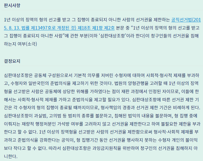 개정된 법엔 기존의 제한 대상에서 ‘집행유예자’와 '1년 미만의 구금형을 선고받은 사람'만 제외되어 있었다. 1년 이상의 형을 선고받아 복역 중인 모든 사람에 대해선 계속 선거권을 박탈하겠단 것이었고, 이는 사실상 법 개정을 안 한 것과 차이가 없었다.